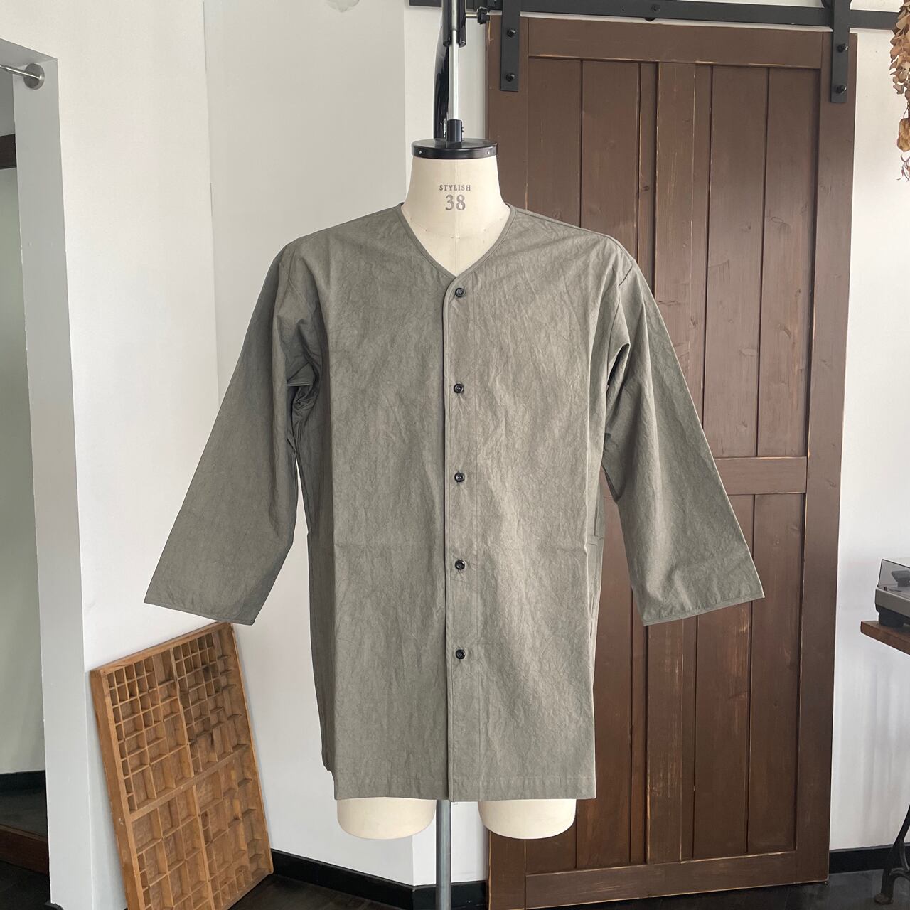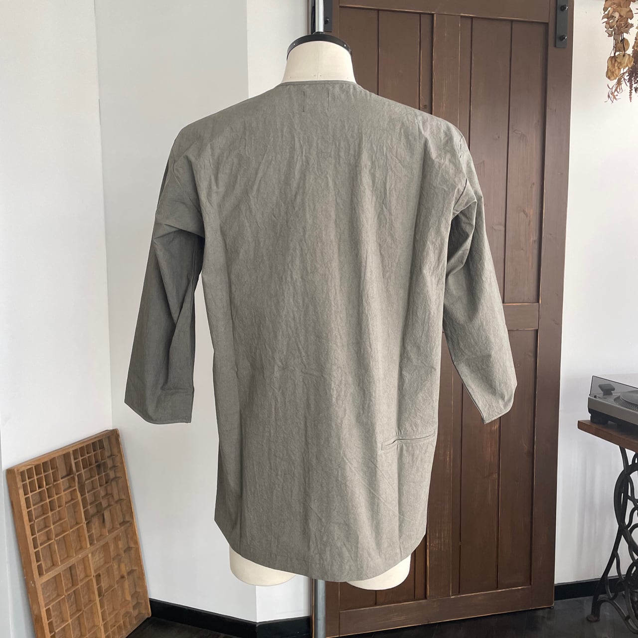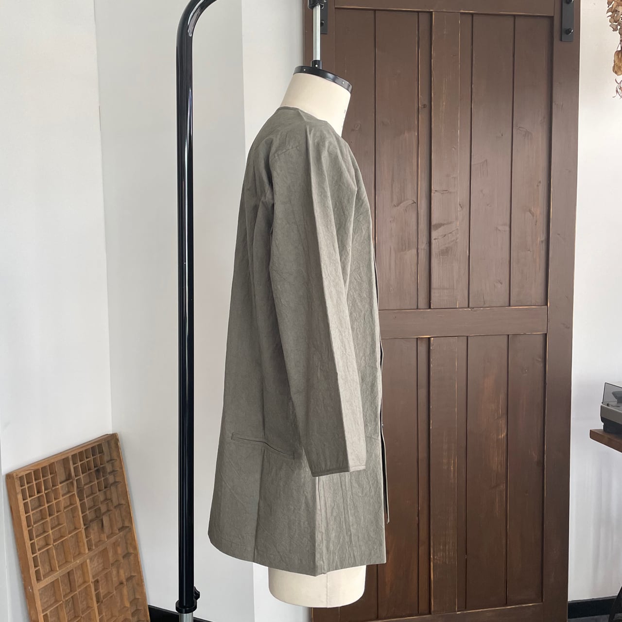 ノーカラーなので首元はスッキリと1枚でも、Tシャツの上にさらりと羽織ってもご着用いただけます。